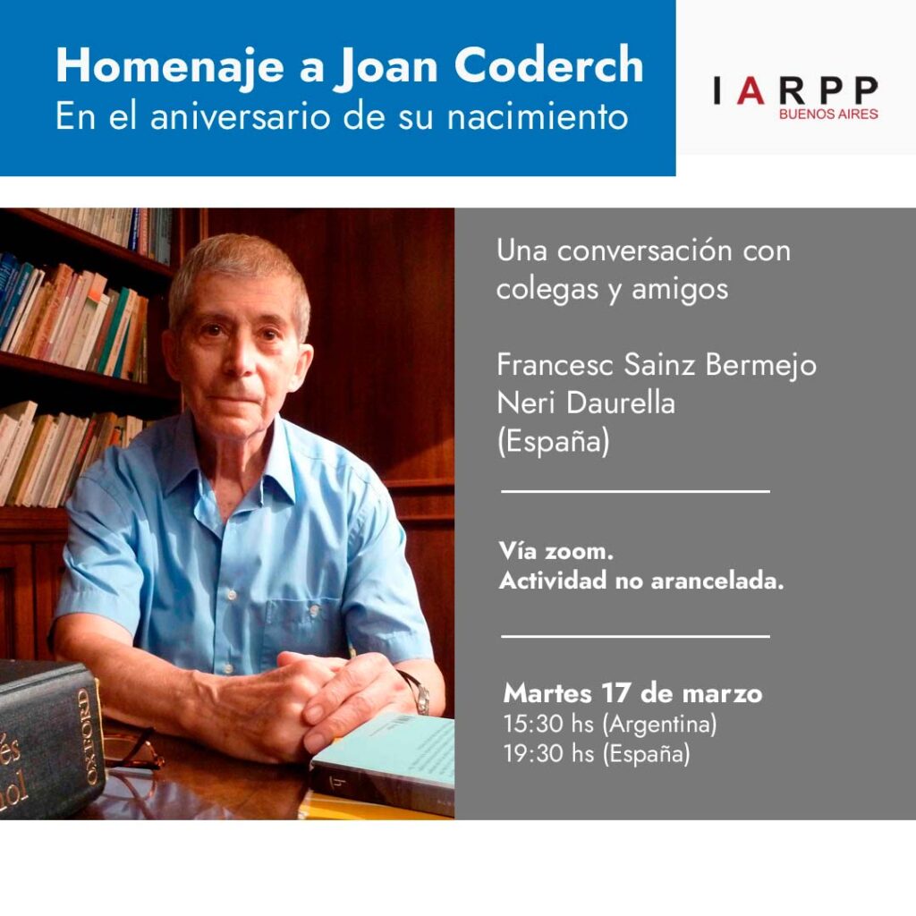 IARPP Buenos Aires invita a un encuentro especial en homenaje a Joan Coderch, a realizarse en el aniversario de su nacimiento, el martes 17 de marzo. Se trata de una conversación íntima y reflexiva con dos colegas y amigos cercanos a su trayectoria: Francesc Sáinz Bermejo y Neri Daurella, desde España.